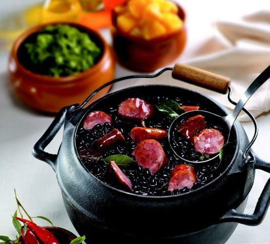 黑豆飯:巴西人的主食,巴西歷史上就是歐、亞、非移民薈萃之地,飲食習(xí)慣深受到葡萄牙、非洲、意大利、日本和土著巴西人的共同影響。真正具有本土淵源的菜肴除了烤肉外,可能就只有巴西豆飯了。黑豆飯(Feijoada)說是飯,其實(shí)和我們?nèi)粘3缘拇竺罪垱Q然不同。它的做法是由巴西黑豆加咸肉、香腸、豬蹄、豬口條、豬尾巴、豬耳朵、豬排骨、煙熏干肉,一同放入巴西泥鍋經(jīng)小火燜燉而成,就著米飯、切成細(xì)條狀的甘蘭菜(Coure)、奶油木薯面(farinha)和切片的柳橙(Laranja)食用。