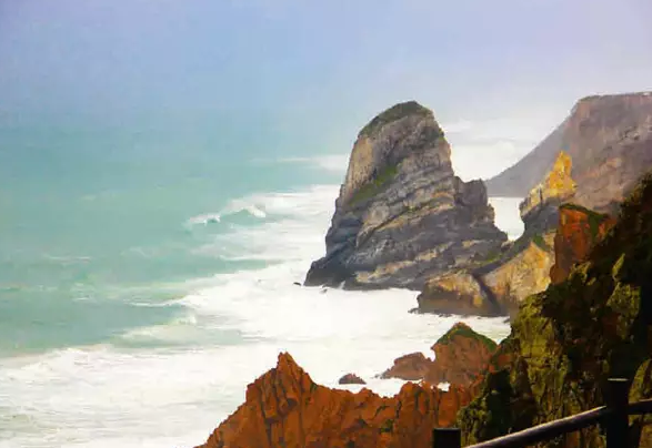 羅卡角:羅卡角是葡萄牙境內一個毗鄰大西洋的海角,是一處海拔約140米的狹窄懸崖,為辛特拉山地西端,距離里斯本大約40公里,是整個歐亞大陸的最西點。一條小路的右側還豎立著一塊白色的石碑,這是國際扶輪社扶輪社的創(chuàng)始人保羅·哈里斯為紀念扶輪社創(chuàng)立75周年的而特意在辛特拉豎立的石碑,這塊紀念碑設在羅卡角顯然有比較現實的寓意。站在羅卡角的懸崖邊,可以無比清晰的感受到大西洋上吹來的颶風,驚濤裂岸、暗礁密佈、碧波涌動、白浪沖天.