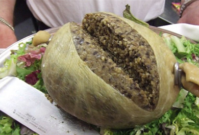 ?哈吉斯: 如果您在蘇格蘭游玩,千萬(wàn)別錯(cuò)過(guò)著名的“哈吉斯”(或稱肉餡羊肚)。第一次吃時(shí)您或許會(huì)有些不適應(yīng),這個(gè)蘇格蘭式的美味是將羊雜(心、肝、肺)、羊脂、洋蔥、燕麥粉和各種調(diào)料磨碎攪拌,然后裝進(jìn)羊的胃中扎緊,放入沸水中煮熟(也有為素食者特別 制作的品種)。在蘇格蘭商店和餐館,這道菜十分常見(jiàn),英國(guó)其他地區(qū)也在嘗試著逐步接受這種食物。吃的時(shí)候佐以蘿卜、甘藍(lán)、土豆,這就是傳統(tǒng)而地道的蘇格蘭大餐了。