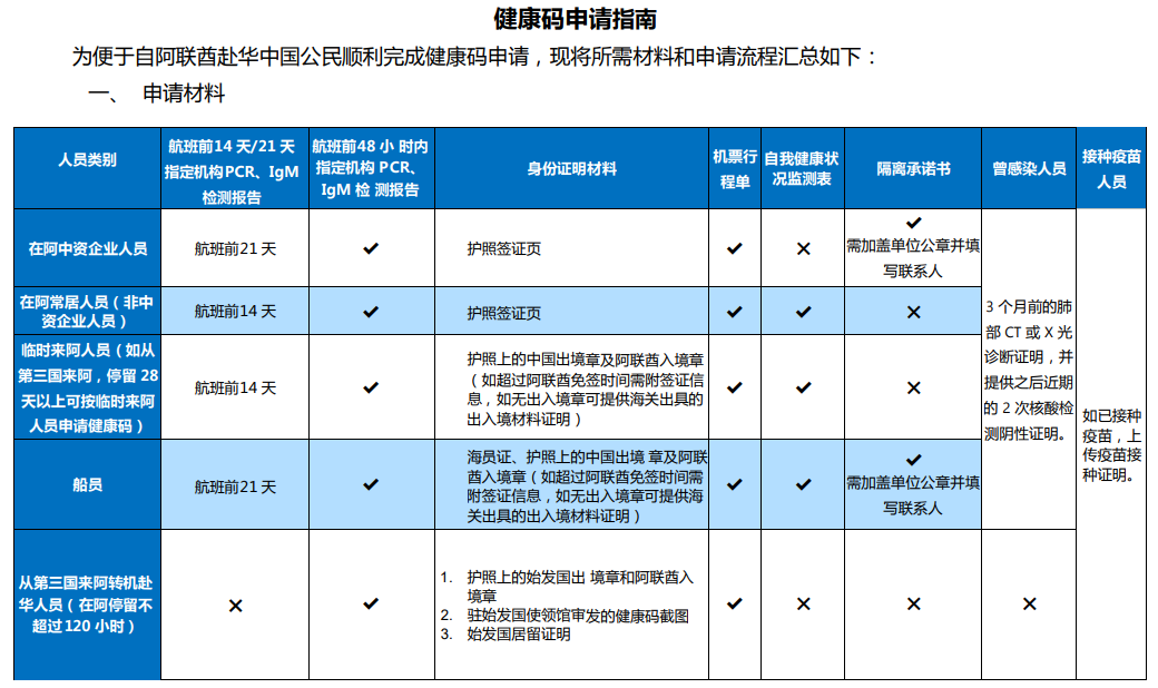 一、中資企業(yè)項(xiàng)目人員 1、登機(jī)前第21天,指定檢測(cè)機(jī)構(gòu)出具的核酸和血清IgM雙檢測(cè)陰性報(bào)告 2、登機(jī)前48小時(shí)內(nèi),指定的另一家檢測(cè)機(jī)構(gòu)出具的核酸和血清IgM雙檢測(cè)陰性報(bào)告 3、全程機(jī)票行程單 4、在阿居留證明 5、經(jīng)所在單位主要負(fù)責(zé)人簽字蓋章的21天自我隔離承諾書 6、疫苗接種證明(如有)
