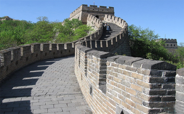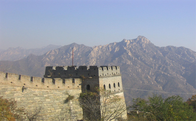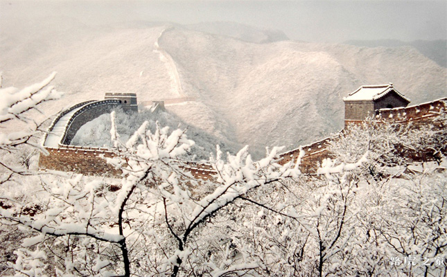 | 長城由山腰直伸山頂,在山頂立一敵樓后,又突然下降,翻身向下返回山腰,又驟然升起,直到海拔940多米的地方,繞了一個大彎,其形狀酷似牛犄角,蒼勁雄渾,人們把它稱之為“牛犄角邊”。長城從“牛犄角邊”繼續(xù)往前延伸,經過一個名叫“箭扣”的地方,這里是已達海拔1044米的山峰,兩側陡峭如削。在修筑長城時,必須從山頭的外側斷崖絕壁上通過,又不能把這個制高點留在外面,使用磚石、木材顯然都不行。于是聰明的能工巧匠們,用了兩根大鐵梁擔在斷崖之上,上面再壘砌磚石,這種方法在整個長城修建史上極為罕見。在慕田峪長城東側,長城本來是順山勢伸向東北。可是到一敵樓處突然分出約1000多米的地段,另辟蹊徑擺向東南方向,山勢盡處,突然終止,在盡頭處修了一個甚是堅固雄偉的敵樓。這段千余米的長城被人們稱之為“禿尾巴邊”。這樣長城在此處就形成了三道長城匯于一樓,“三面極目觀巨龍”的景觀。在慕田峪長城“牛犄角邊”的兩側,有一段長城被稱為稱為“箭扣”及“鷹飛倒仰”。墻體全部建在巖石裸露的懸崖峭壁上,長城的坡度大都在50度左右,其中有一節(jié)接近90度,幾近垂直,臺階僅有幾尺寬,非勇敢者不敢涉足。 |