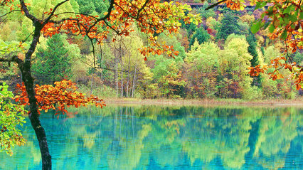 五彩池雖在九寨溝眾海中最小巧玲瓏,然而它的色彩卻是最為斑斕。其上半部呈碧藍(lán)色,下半部則呈橙紅色,左邊呈天藍(lán)色,右邊則呈橄欖綠色。池水異常清澈,透過池水,可見到池底巖石的花紋,由于池底沉淀物的色差以及池畔植物色彩的不同,原本湛藍(lán)色的湖面也被映襯的五彩斑斕。