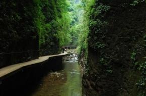 【神泉峽】有請各位朋友注意,我們行走到這里,您會發(fā)現(xiàn),峽谷在這一段猛然一下子收縮了,變得越來越窄了。這段很窄的峽谷叫做神泉峽,總長300余米。在神泉峽,我們要穿過兩處水簾瀑,請大家保護好自己的攝像機、照相機等貴重物品,以免打濕受損。同時還要注意腳下,慢慢行走,因為這一段的木板棧道很滑。