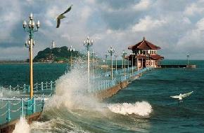 棧橋簡介: 棧橋是青島的象征。位于青島灣中,與市內(nèi)最繁華的中山路成一條直線,由海岸前伸入海,素有“長虹遠引”之美譽。棧橋初建于光緒十八年(公元1892年),是青島最早的碼頭。經(jīng)1931年改建和1985年整修,現(xiàn)寬8米,全長440米。橋南端筑半圓形防波堤,堤內(nèi)是一座具有民族風(fēng)格的兩層八角亭,金瓦朱壁,盔頂飛檐,題名“回瀾閣”。棧橋劃波斬浪,像一條長龍橫臥于碧海銀波。循橋漸入,仿佛走進大海的懷抱;佇立閣旁,層層巨浪澎湃涌來,拍打堤壩,擊起萬千碎玉;