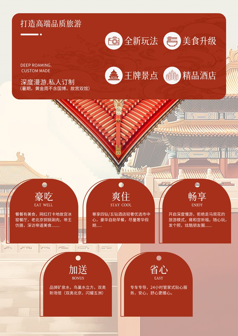 【皇家惠游】-北京品質(zhì)5日游-不帶錢包游帝都 0自費(fèi)O購物O景交 皇家惠游 O 購物 0 自費(fèi) 0 景交 O 暗店 —漫游帝都,追憶冬奧精神…… 住的舒心:精選北京中... |