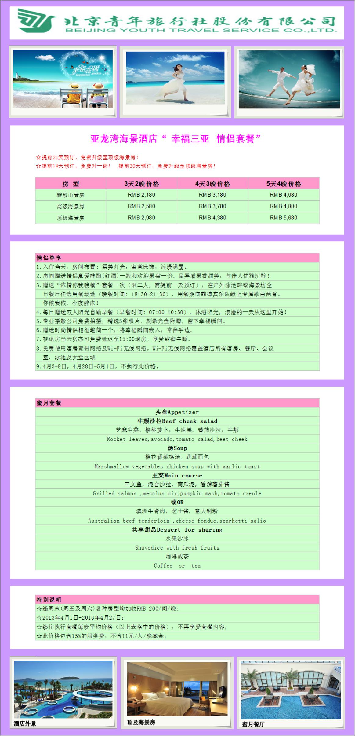 3.贈送“濃情你我晚餐”套餐一次(限二人,需提前一天預訂),在戶外泳池畔或海景坊全