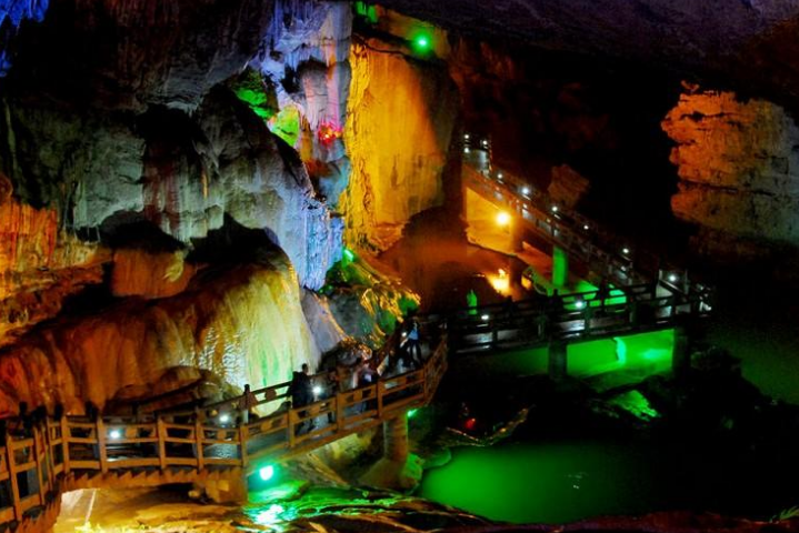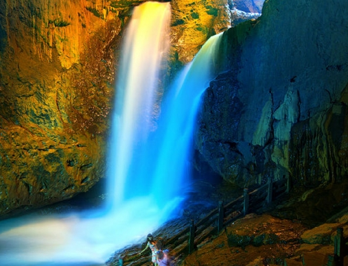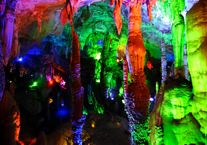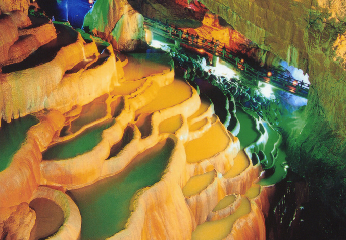 終于到達目的地,一下車,感受到的竟是濃濃的特色風情,陽光很明媚,很多賣帽子的、民族服飾等等,簡直是人山人海,一下變得熱鬧了起來,我們的心情也變得異常地激動,接下來拍著隊跟著導游去取票。就在導游的帶領下前往景區(qū)了,我們終于到達了期待很久的地方——九鄉(xiāng)溶洞,一個夢幻般的地方。在這里許許多多大小的溶洞,各種顏色的燈光照耀之下用手機拍下來顯得異常地光彩奪目,令人心醉不已。還有一層一層地疊層石很是奇特,中間滿滿地清澈水流順勢而流下來,整個一大塊看來似是稻田卻不是稻田,用手蘸下清澈的水流瞬間浸入心田太涼了。有時候從洞中望天空中望去,興許就有一個大洞,只能看見天空的一角,此刻我們這些人或許就真成了井中之蛙了,每個地方都很是令人驚訝、贊嘆!不一會,潔白的瀑布飛流直下,雖說不是很大,但卻甚似那些大的瀑布,從地底下望去似有飛流直下三千尺之勢、異常驚險,簡直令人心懼魂飛,太壯觀了!