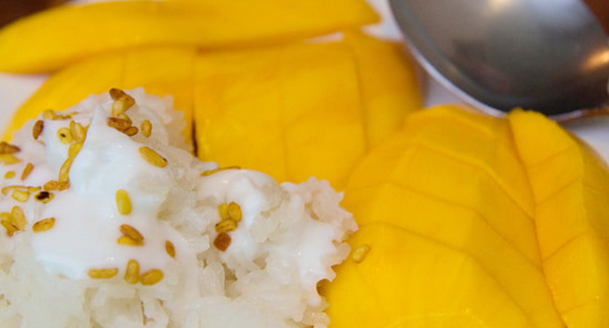 芒果糯米飯:芒果糯米飯是泰國特色的甜品小吃,將芒果整顆切塊裝入盤中,另一側(cè)放入淋上椰汁的糯米飯,賣相十分簡單,可是令人意想不到的是,這么簡簡單單的組合,竟然能在口里發(fā)生神奇的“反應(yīng)”。北京旅行社工作人員表示,芒果是甜中帶一點(diǎn)點(diǎn)的酸,這一點(diǎn)點(diǎn)酸,在口中品得分外清晰,就那一瞬間,酸味就被糯米飯的甜味給融化了,可這一瞬間融化的感覺,又是這樣絲毫不落地在口中就能品味得到。糯米飯和芒果實(shí)在是配合得天衣無縫。