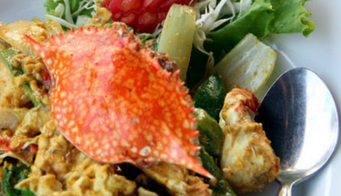 咖喱炒蟹:極受歡迎的泰國名菜,切塊的紅蟹加上配菜與咖喱和各式香料共炒,突出蟹肉的鮮味與彈性,風(fēng)味獨(dú)特。